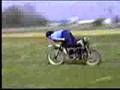 Description: a fat girl goes over a bump and crashes her morotrbike |